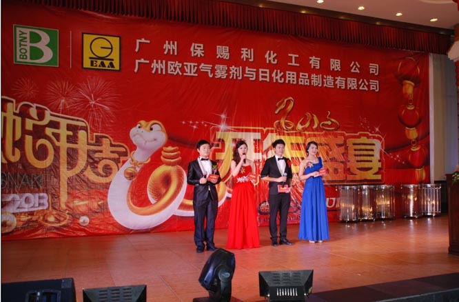廣州保賜利化工有限公司、廣州歐亞氣霧劑與日化用品制造有限公司籌備多日的新春開年晚宴于2013年2月28日晚6點在從化南海食街拉開序幕,近兩千多人的晚宴現場顯得熱鬧非凡,充滿著激情、熱烈、活躍的氣氛。