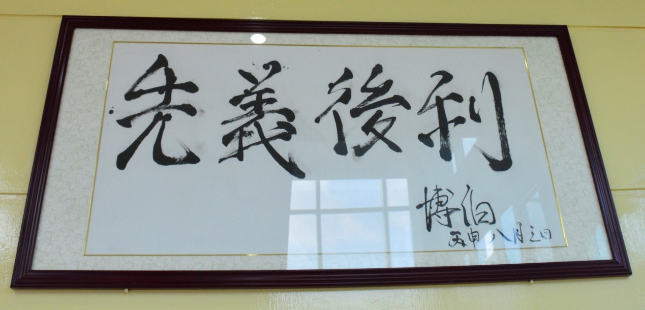 (“先義后利”四個字牌匾掛在行政樓顯眼處)