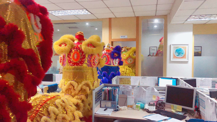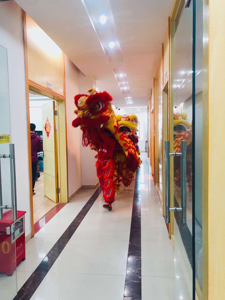 隨后,各彩色舞獅在鑼鼓聲中來到各辦公區(qū)域向各位員工拜年,