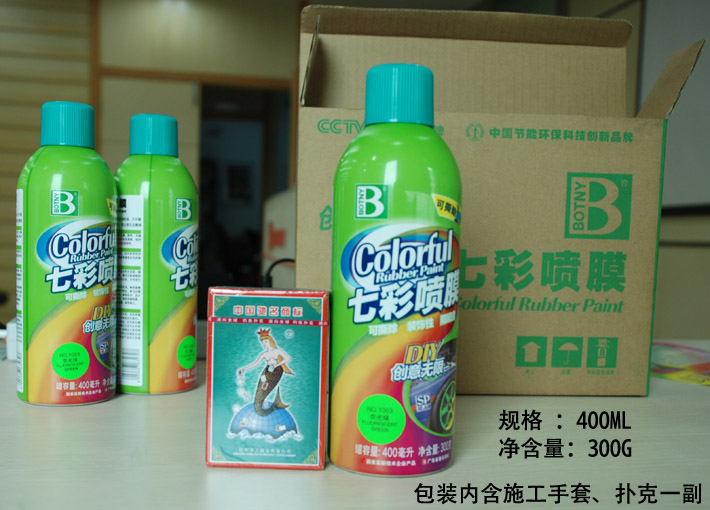 七彩噴膜是一種自然干燥的人造橡膠涂覆層,適用于各種金屬、塑料、木制品等表面,噴涂后可在物體表面形成一種柔韌可剝離的有色薄膜,保護物體表面,防水、耐磨,多種顏色可選(熒光綠、熒光金黃、熒光藍、熒光桃紅、熒光紅、熒光橙、熒光紫),具有很好的美化裝飾性。可使用于汽車、摩托車、自行車的金屬構件和烤漆表面的改色,也可使用在木材、玻璃、塑料、混凝土、布料、皮制品、陶瓷等需要改色的表面上。