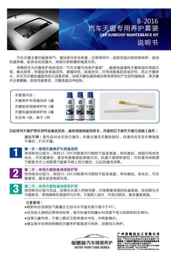 保賜利專為天窗養(yǎng)護而研發(fā)的“汽車天窗專用養(yǎng)護套裝”,能夠快速清除天窗各部位頑固污垢、氧化層等,恢復(fù)膠條表面活性、增強韌性、延緩老化,可有效提高膠條密封性,防止天窗滲水,并可為天窗軌道提供持久潤滑效果,消除天窗軌道異響及降低使用時產(chǎn)生的機械噪音,使天窗關(guān)合更順暢、膠條性能更優(yōu)、天窗表面潔凈如新。
